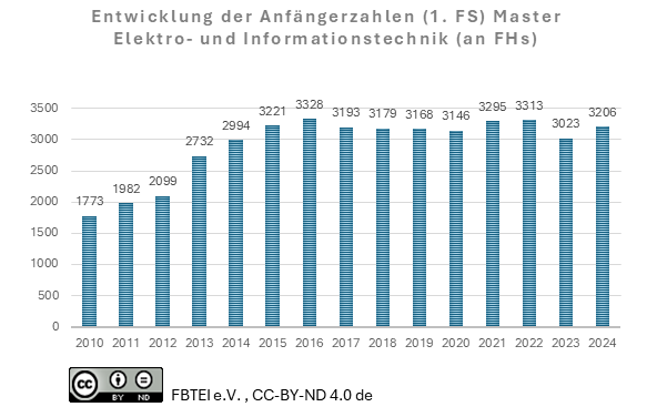 Im Jahr 2024 haben insgesamt 8.401 Studierende ein Bachelorstudium der Elektro- und Informationstechnik begonnen (1. Hochschulsemester). Die Änderungen gegenüber dem Vorjahr (8426 Studierende) sind nicht signifikant. Damit bestätigt sich die bereits im Jahr 2023 beobachtete Stabilisierung der Anfängerzahlen, wenngleich das Niveau weiterhin unterhalb früherer Höchststände liegt.